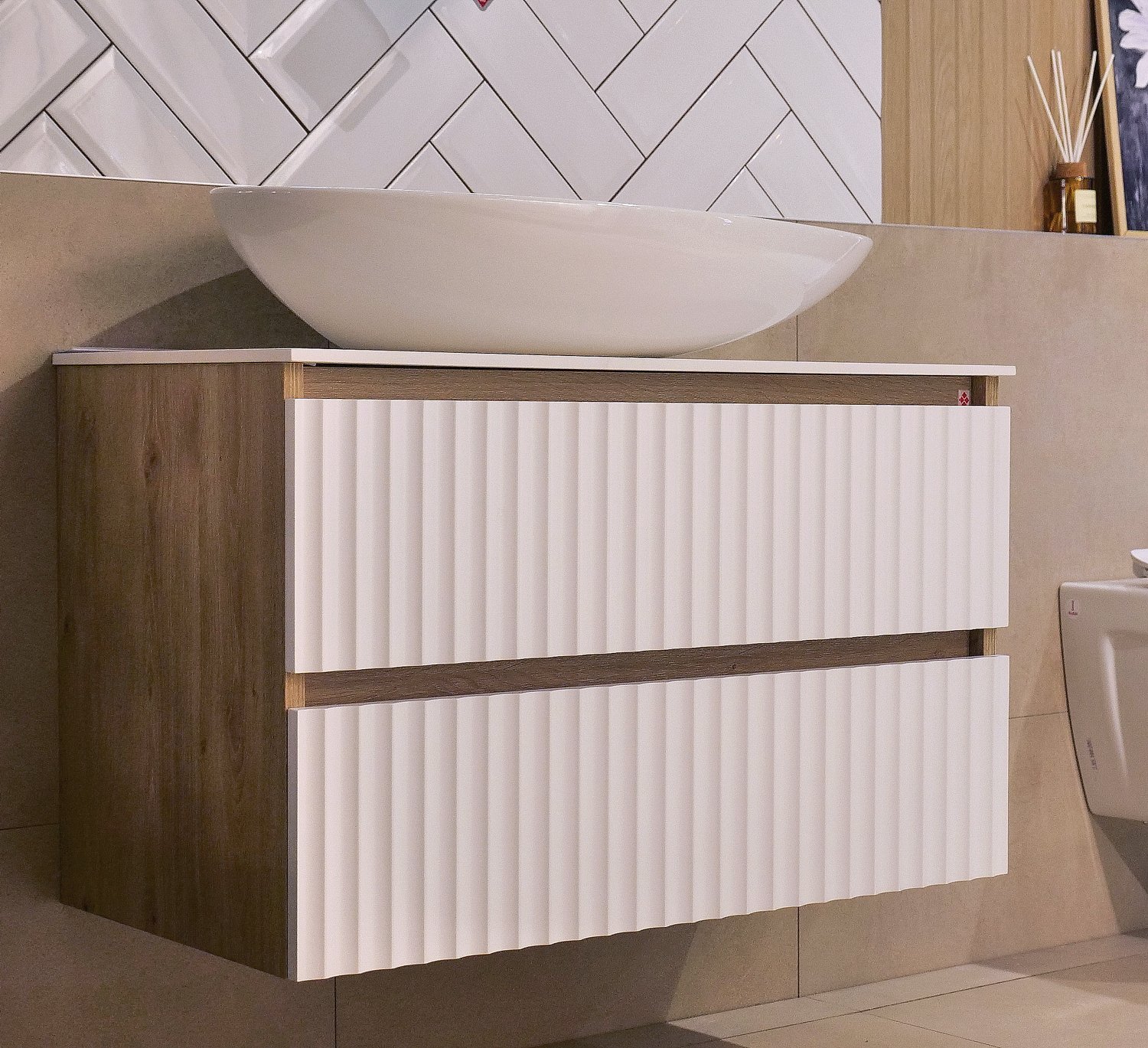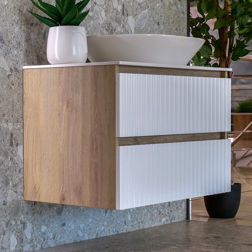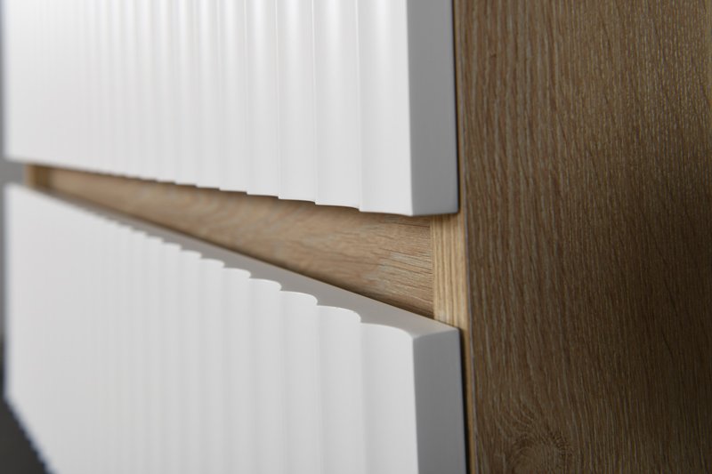 Model **PALERMO LINE 80** (konzolni ormarić, bez pripadajućeg umivaonika) poseduje dve fioke sa reljefnim frontom u mat beloj boji, bez ručki. Fioke su tipa **metalbox**, sa sporozatvarajućim metalnim vođicama i usporivačem.