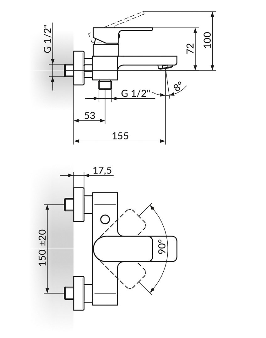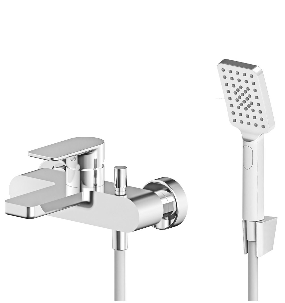 Moderna jednoručna baterija za kadu sa ručnim tušem, minimalističkog dizajna sa telom od mesinga i hromiranom završnom obradom, zidna montaža.